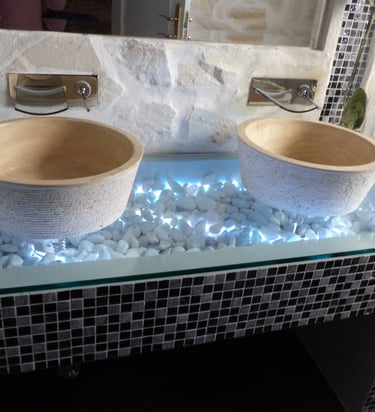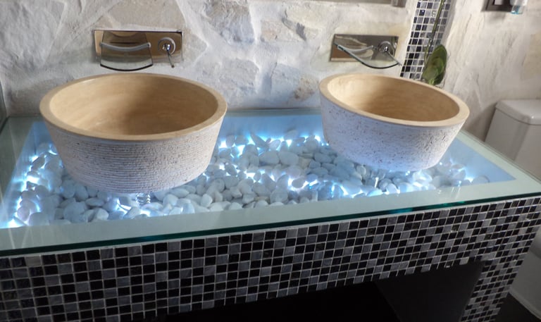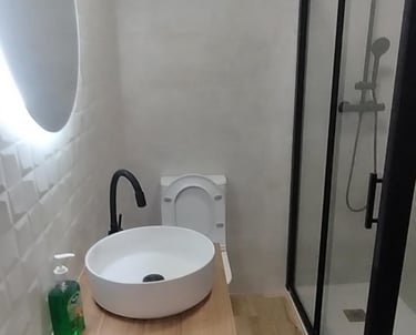 En este proyecto, en Reformas Juma diseñamos un baño exclusivo con un mueble de lavabo fabricado completamente de obra, combinando piedra, vidrio y elementos decorativos con iluminación LED integrada. El diseño incorpora lavabos de superficie y grifos de buzón empotrados, logrando una estética moderna, funcional y visualmente impactante. Este tipo de trabajos nos permite fusionar creatividad y técnica para ofrecer soluciones únicas, adaptadas al estilo de cada cliente. Nuestro objetivo siempre es transformar cada estancia en un espacio elegante, práctico y duradero, cumpliendo con los más altos estándares en reformas de baños en Málaga
